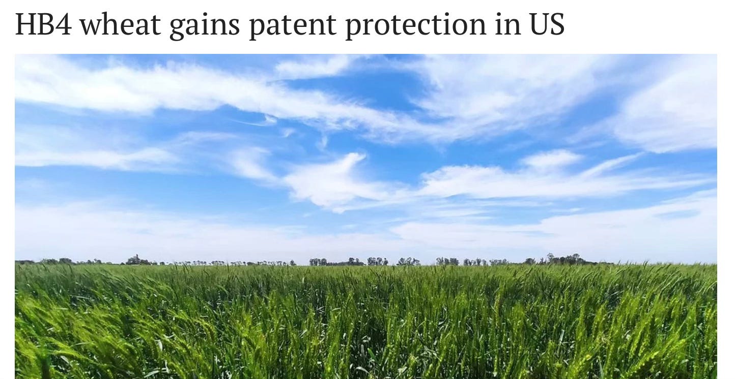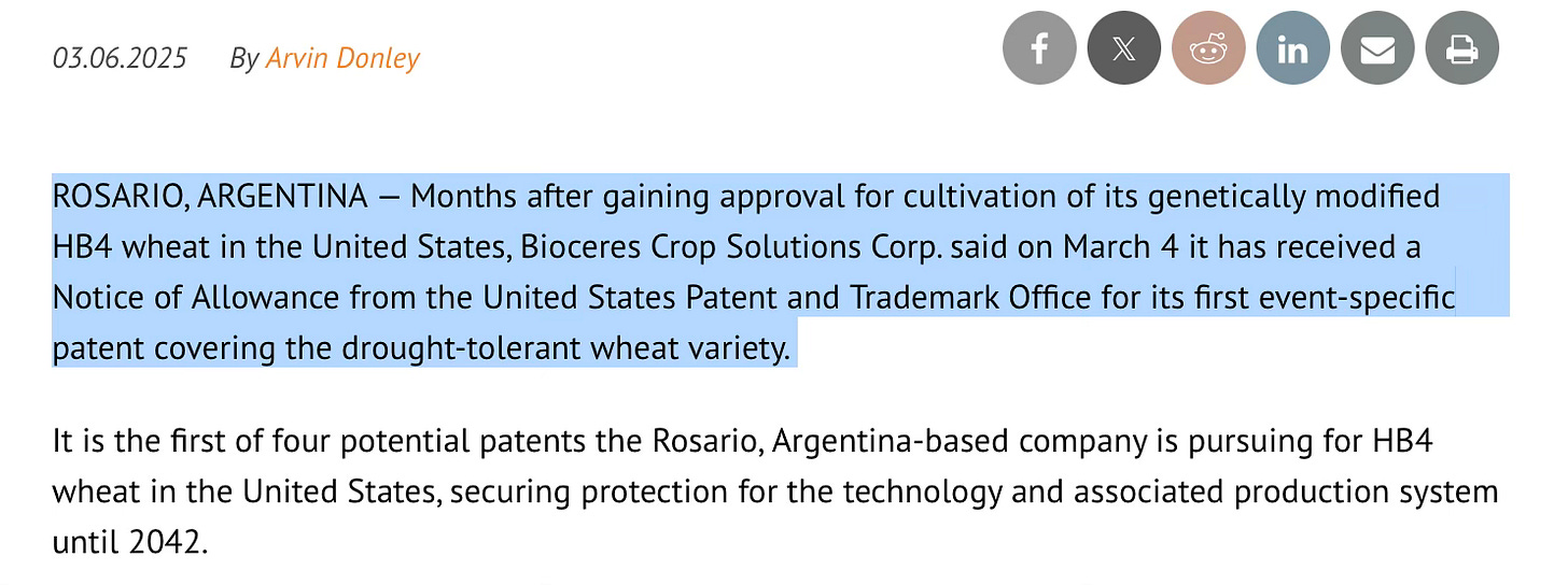 A new GMO wheat variety called HB4 was developed by Bioceres Crop Solutions, who holds the intellectual property rights for this “drought-tolerant” GMO wheat, with patent protection secured until 2042.