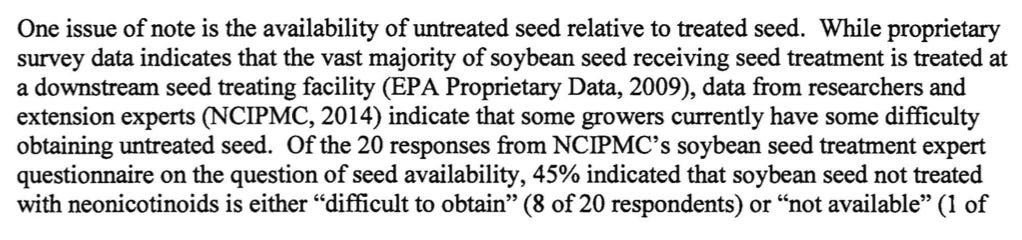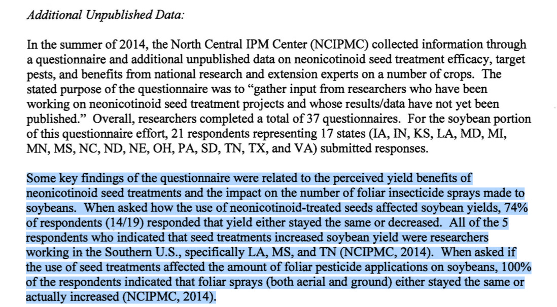 In fact the EPA’s own analysis (ref) concluded that neonicotinoid seed treatments on soybeans provide “little or no overall benefit” in terms of crop yield. In some cases, yields actually declined….