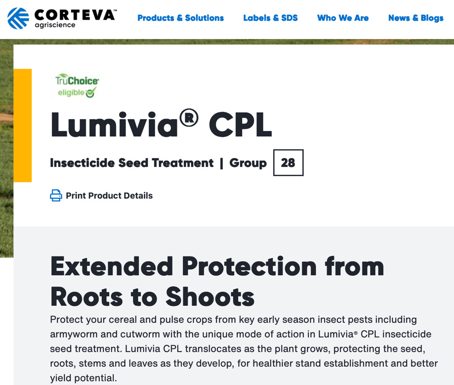 Another example comes from the agricultural company Corteva, which markets seed treatment products designed for a wide range of cereal crops including corn, barley, millet, oats, rye, triticale, and wheat.