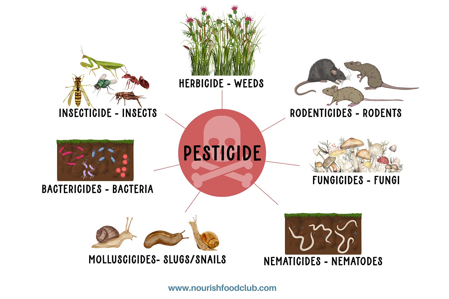 The term pesticide is actually an umbrella category that includes many different types of chemicals, each targeting different organisms. For example: