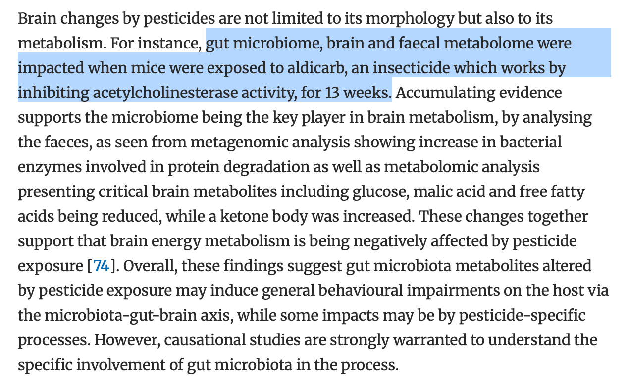 Another study examining honey bees found that bees exposed to the insecticide imidacloprid showed significant changes in gut microbiome composition (ref), including reduced growth of beneficial gut bacteria even at low pesticide concentrations.