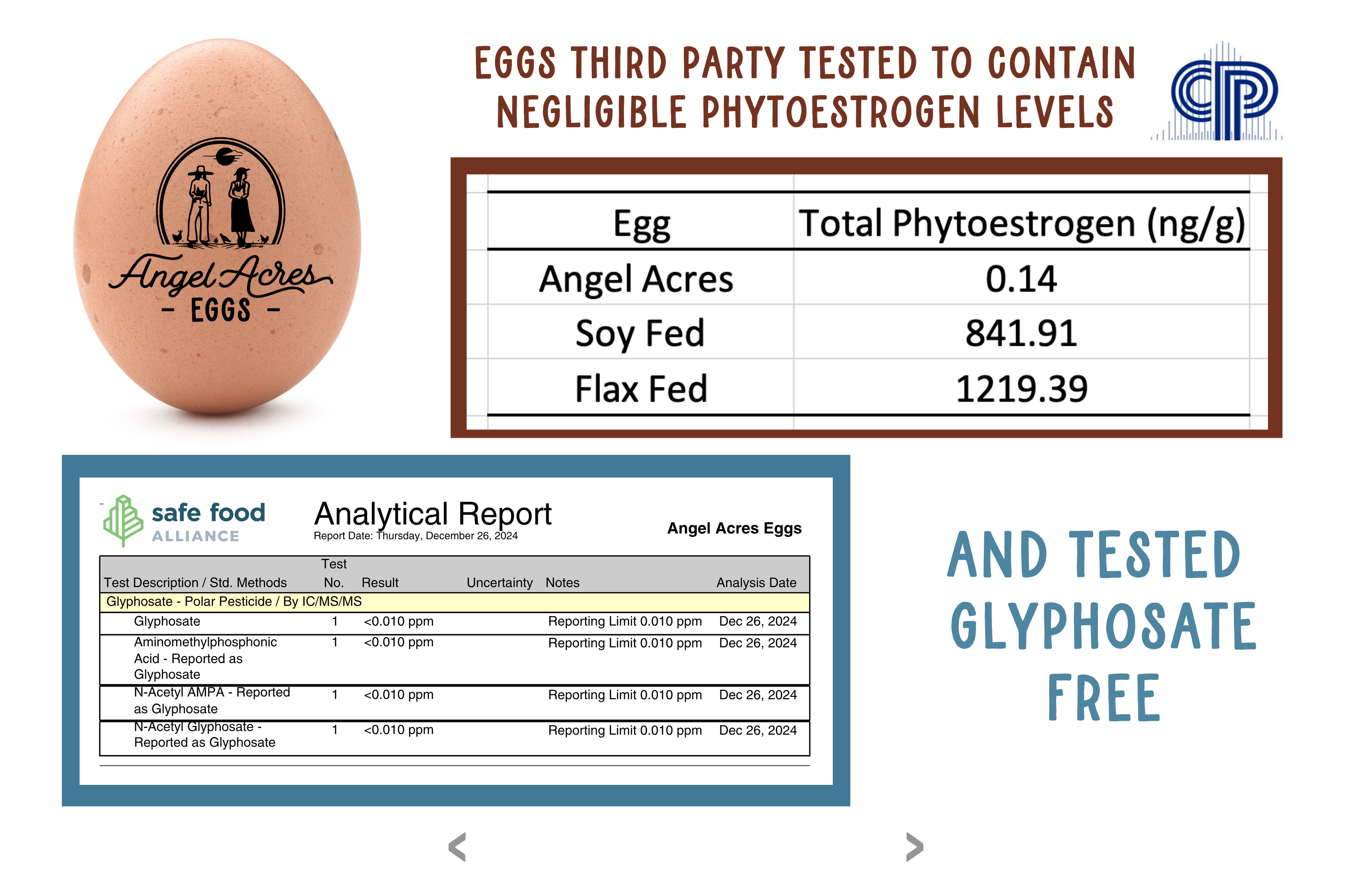 - - Eggs have been found with glyphosate levels well above international safety thresholds (r,r) - one report showed samples with over 100 parts per billion (ppb). (r) Even organic, cage-free eggs have tested as high as 169 ppb, more than three times the EPA’s allowable limit of 50 ppb. (r,r)
