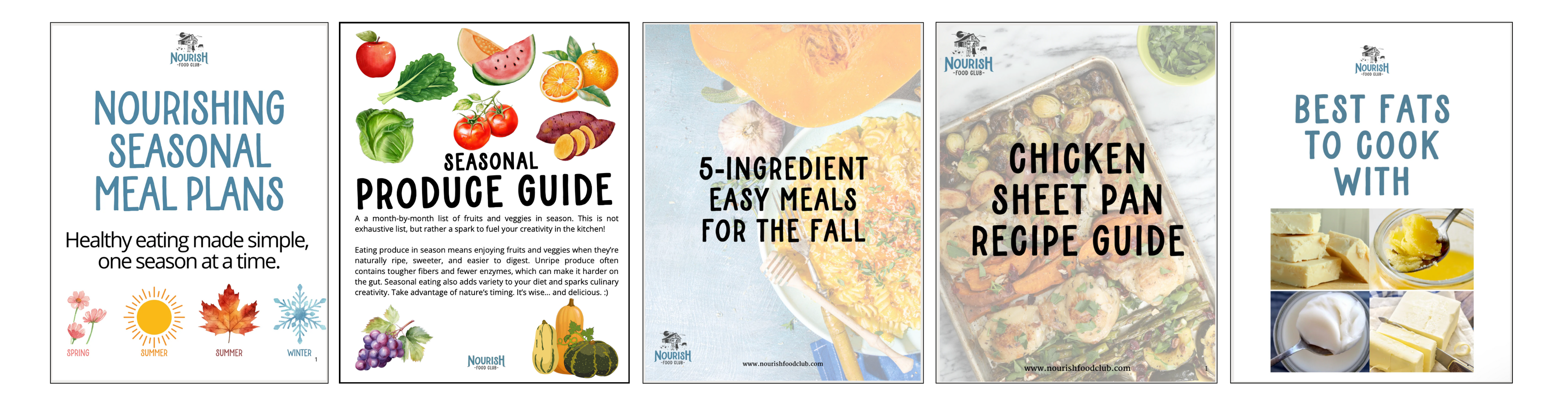 - - Seasonal Produce Guide: a month-by-month guide to produce in season, which can support better digestion & spark culinary creativity.