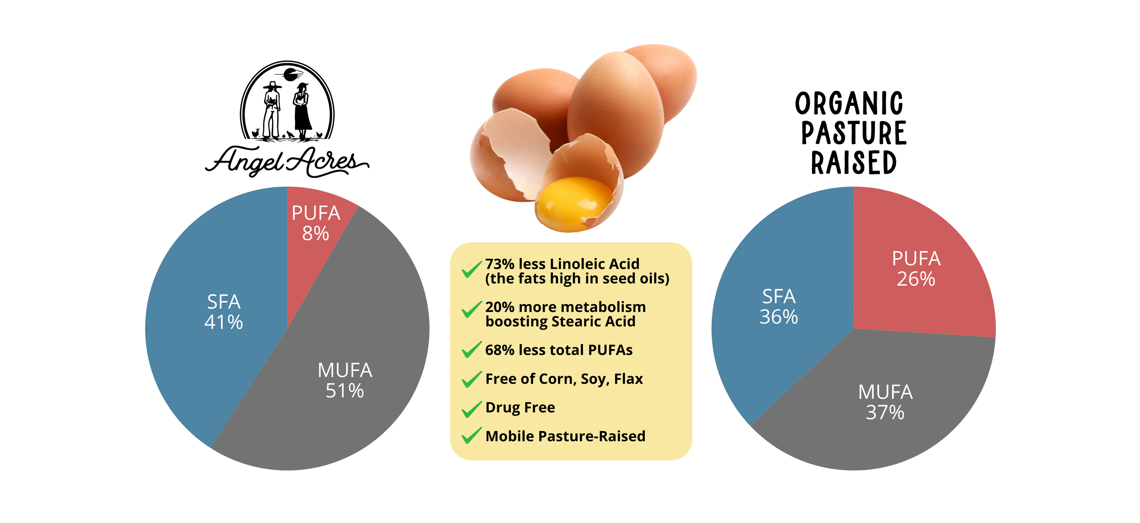 At Angel Acres, we’ve chosen a different path, creating our own feed that’s free of corn, soy, seed oils, and other high-PUFA ingredients, so our eggs deliver the cleanest, healthiest fats for your body.